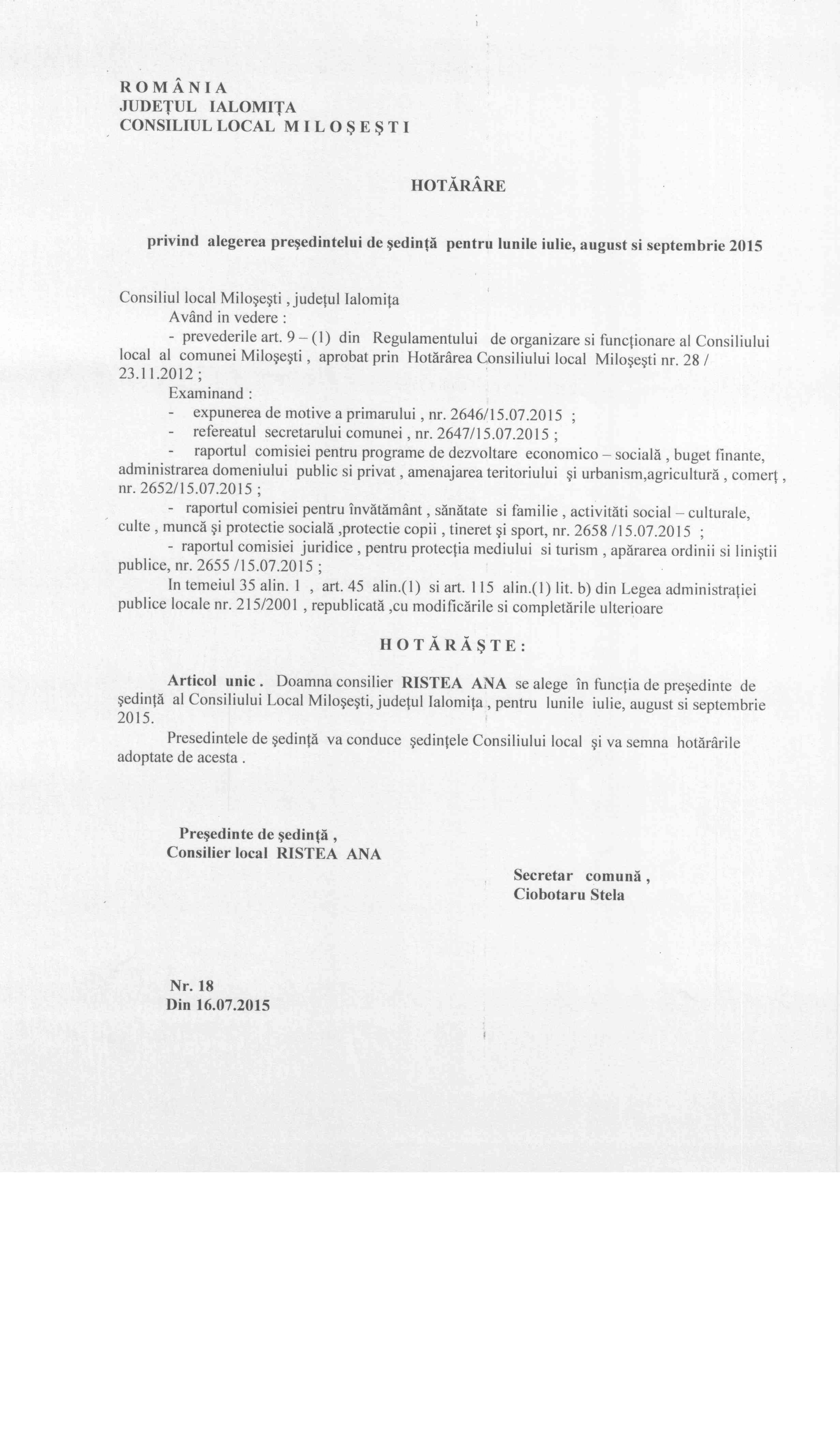 - Hot. nr. 18/16.07.2015 privind alegerea presedintelui de sedinta pt. lunile iulie, august si septembrie 2015.