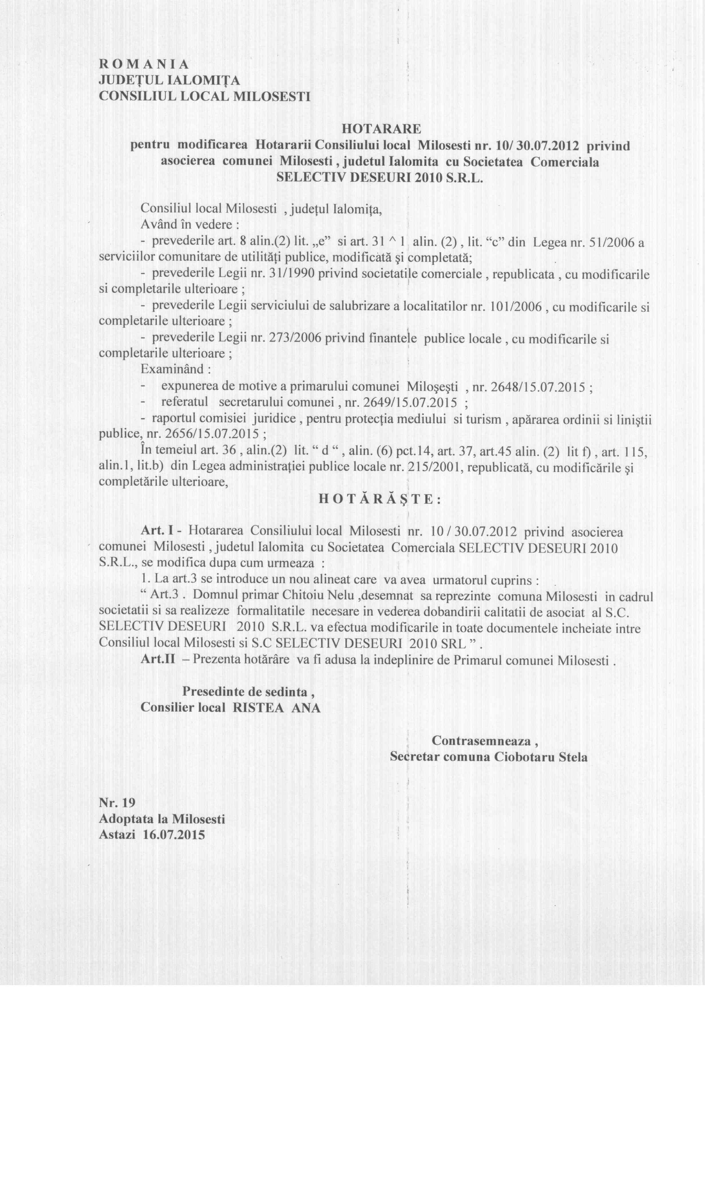 - Hot. nr. 10/30.07.2012 privind modificarea Hotararii Consiliului local Milosesti nr. 27 / 25.07.2011 privind asocierea comunei Milosesti , judetul Ialomita cu Societatea Comerciala SELECTIV DESEURI 2010 S.R.L.